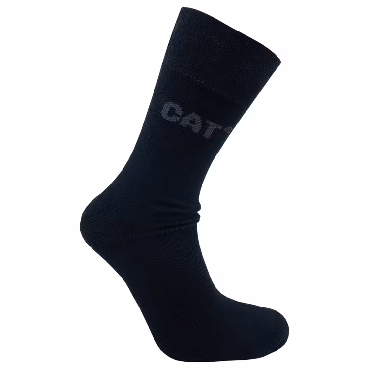 Finstickade komfortstrumpor med en dämpad sula av extra mjuk frotté i mycket hög kvalitet från Caterpillar i svart. Broderad mörkgrå Cat-logo på skaft.