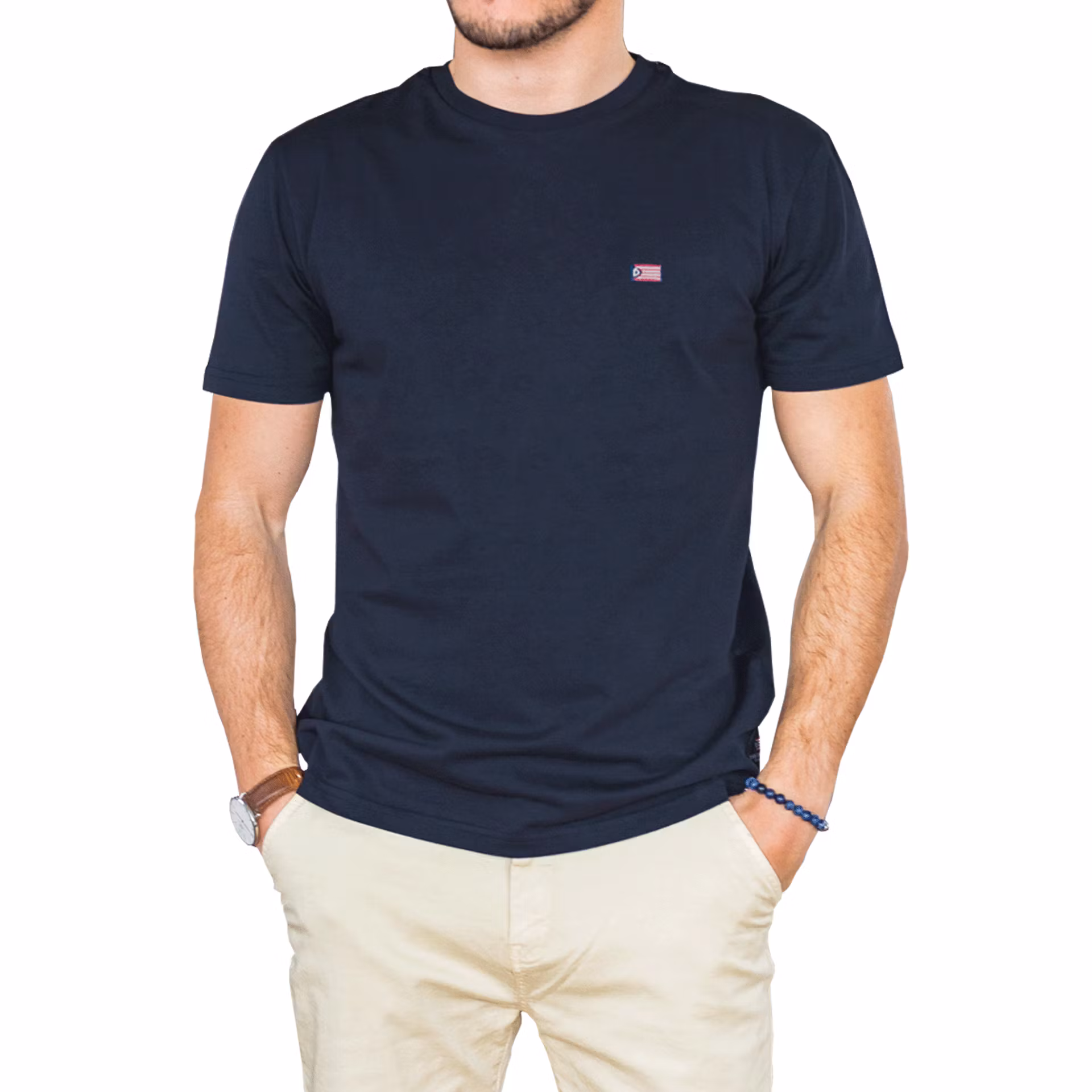 Navy o-ringad t-shirt med liten flagga på bröst från svenska The Defender